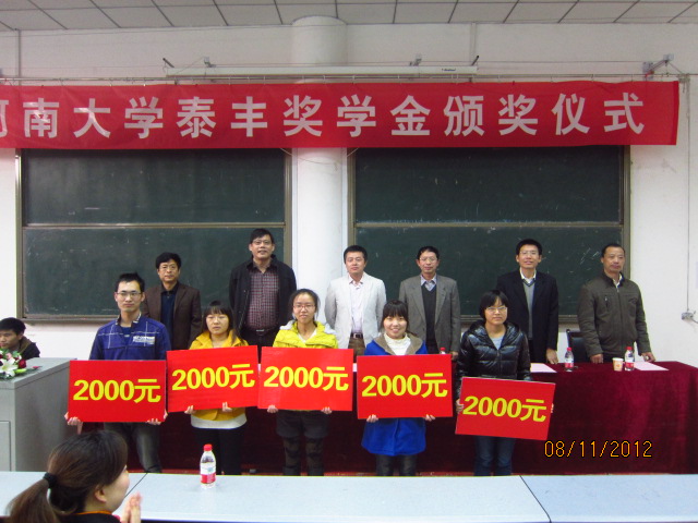 寒冬刚至,暖意来袭。2012年11月8日,第一届威尼斯9499登录入口泰丰奖学金颁奖仪式在威尼斯官网报告厅举行。威尼斯官网96届药学校友、河南省泰丰投资有限公司董事长徐攀峰及黄河学者陈东升、学院领导出席。仪式由院党委副书记刘迎红主持。
