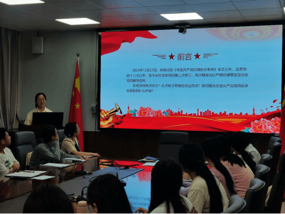 在党纪学习环节,鲁蒙蒙将《条例》新增与修改部分进行了逐条解读,从修改背景、理解执行等方面带领大家进行深入学习。她指出,新修订的《条例》在总结实践经验的基础上,与时俱进地完善了纪律规范,为全面加强党的纪律建设提供了重要遵循。鲁蒙蒙特别强调了党中央对纪律规范的重视,警示党员干部要时刻严格要求自己,从日常行为中筑好纪律堡垒。